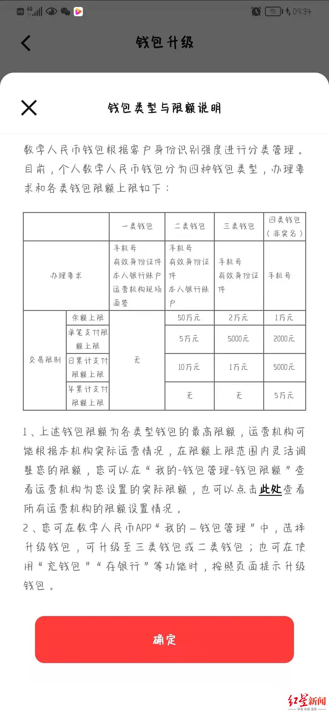 四类钱包可在APP内在线升级至二类、三类。在输入数字人民币钱包支付密码、姓名、身份证号,完成人脸核验后,无需输入银行卡号,APP自动提醒转入手机已经安装的商业银行APP完成绑定,整个升级过程一分钟内即可完成,方便快捷。